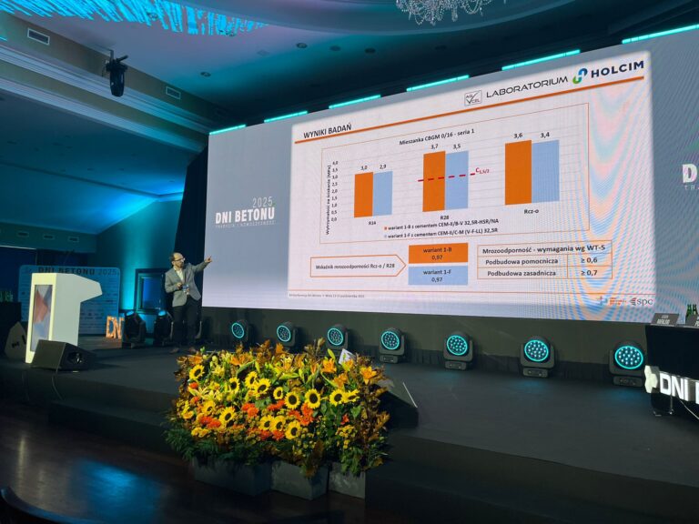 Mieliśmy również zaszczyt wygłosić prezentację dotyczącą możliwości zastosowania innowacyjnego, niskoemisyjnego cementu CEM-II/C-M (V-F-LL) 32.5R